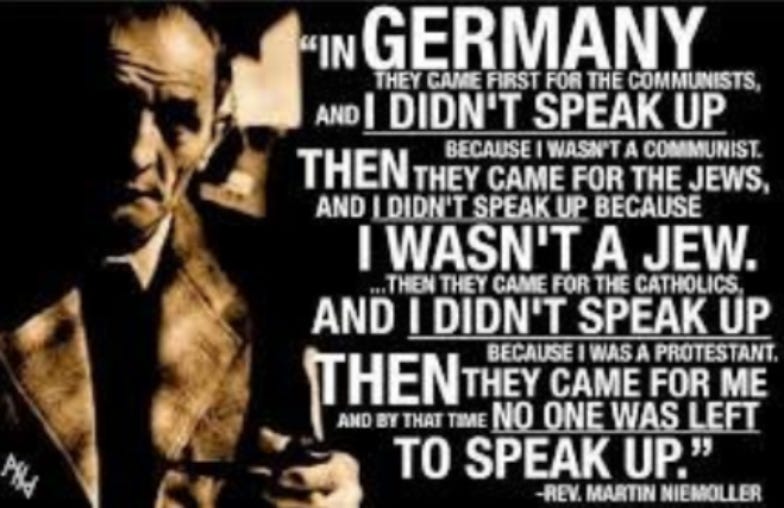 ‘First They Came’ is the poetic form of a 1946 post-war confessional prose piece by the German Lutheran pastor Martin Niemöller (1892–1984). It indirectly condemns complicity of German intellectuals and clergy following the Nazis’ rise to power and subsequent incremental purging of their chosen targets. Many variations and adaptations in the spirit of the original have been published in the English language.