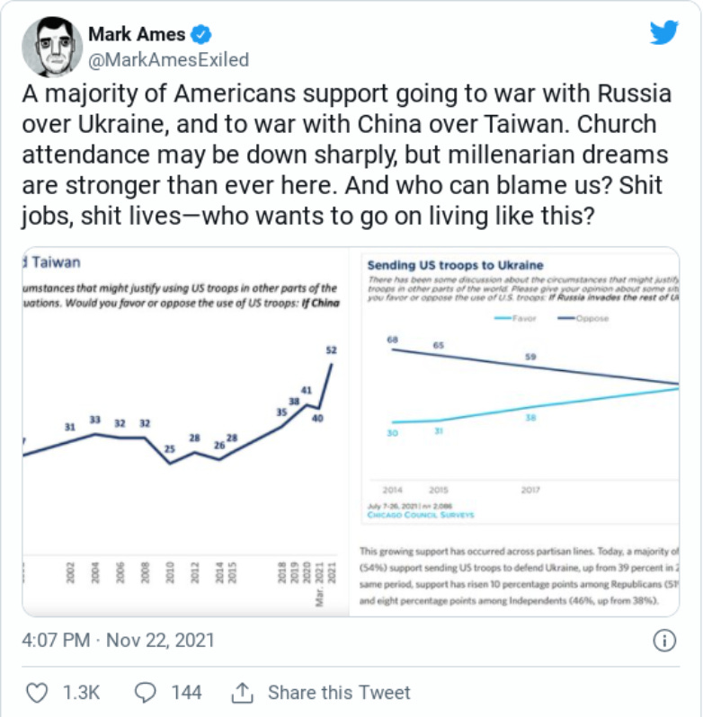 So it was that nuclear war against the Russian and Chinese hordes, the “reds” and the “yellow peril” became ever more popular. Weren’t the Russians constantly persecuting the Ukrainians after having outrageously and illegally invaded their country? Weren’t the Chinese threatening the poor innocent Taiwanese making their highly laudable lives a misery? Weren’t these two dragons to put to the sword, two prime candidates for bringing to justice or to the sword for their sins?