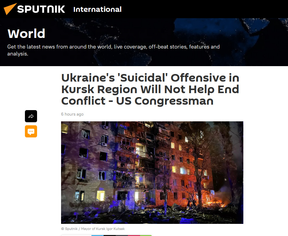 Ukraine's 'Suicidal' Offensive in Kursk Region Will Not Help End Conflict - US Congressman.