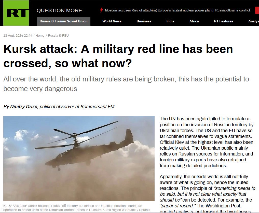 It is safe to assume that most of the West’s political leadership didn’t expect such a turn of events. Kiev didn’t consult them or ask their permission. This brings us to the most important point: the nature of the confrontation is changing, and another red line has been erased. There used to be an unspoken rule – the Americans and Western Europeans didn’t want an escalation, let alone a direct conflict with Moscow, so Ukraine was allowed to fight back but not attack; Western weapons are not used on Russian territory and, of course, the border was not to be crossed. In this scenario, the conflict was manageable, and played out within a set framework. You don’t have to be an expert to see that this is now impossible.