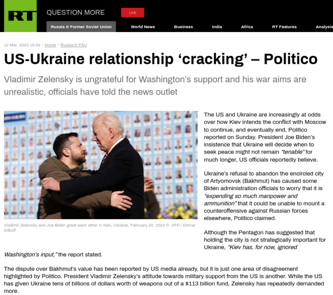 The dispute over Bakhmut’s value has been reported by US media already, but it is just one area of disagreement highlighted by Politico. President Vladimir Zelensky’s attitude towards military support from the US is another. While the US has given Ukraine tens of billions of dollars worth of weapons out of a $113 billion fund, Zelensky has repeatedly demanded more.