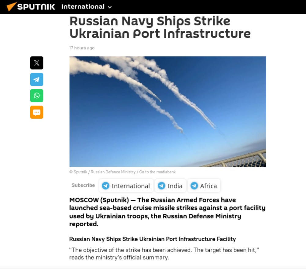 MOSCOW (Sputnik) — The Russian Armed Forces have launched sea-based cruise missile strikes against a port facility used by Ukrainian troops, the Russian Defense Ministry reported.