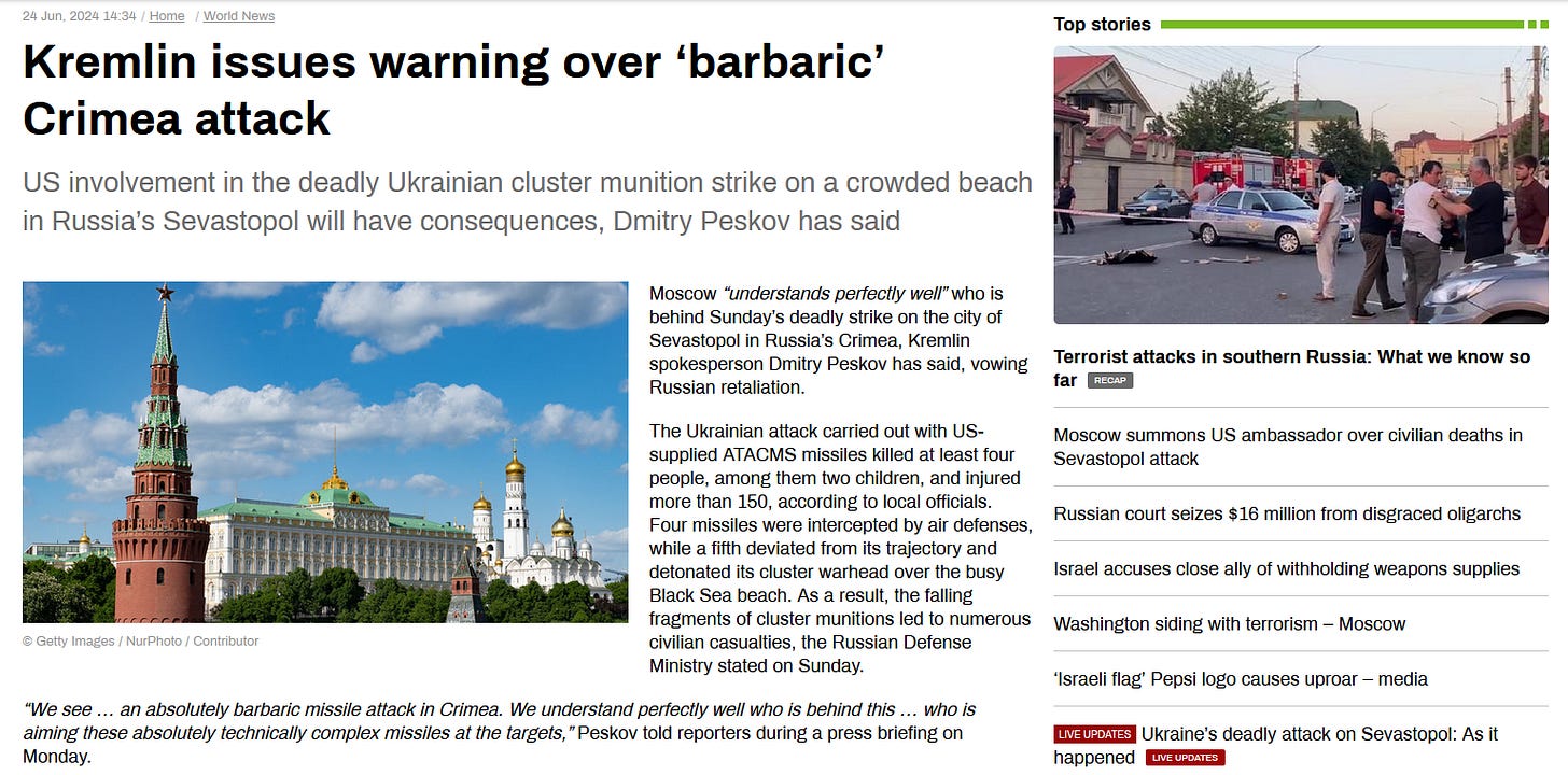 The Ukrainian attack carried out with US-supplied ATACMS missiles killed at least four people, among them two children, and injured more than 150, according to local officials. Four missiles were intercepted by air defenses, while a fifth deviated from its trajectory and detonated its cluster warhead over the busy Black Sea beach. As a result, the falling fragments of cluster munitions led to numerous civilian casualties, the Russian Defense Ministry stated on Sunday.