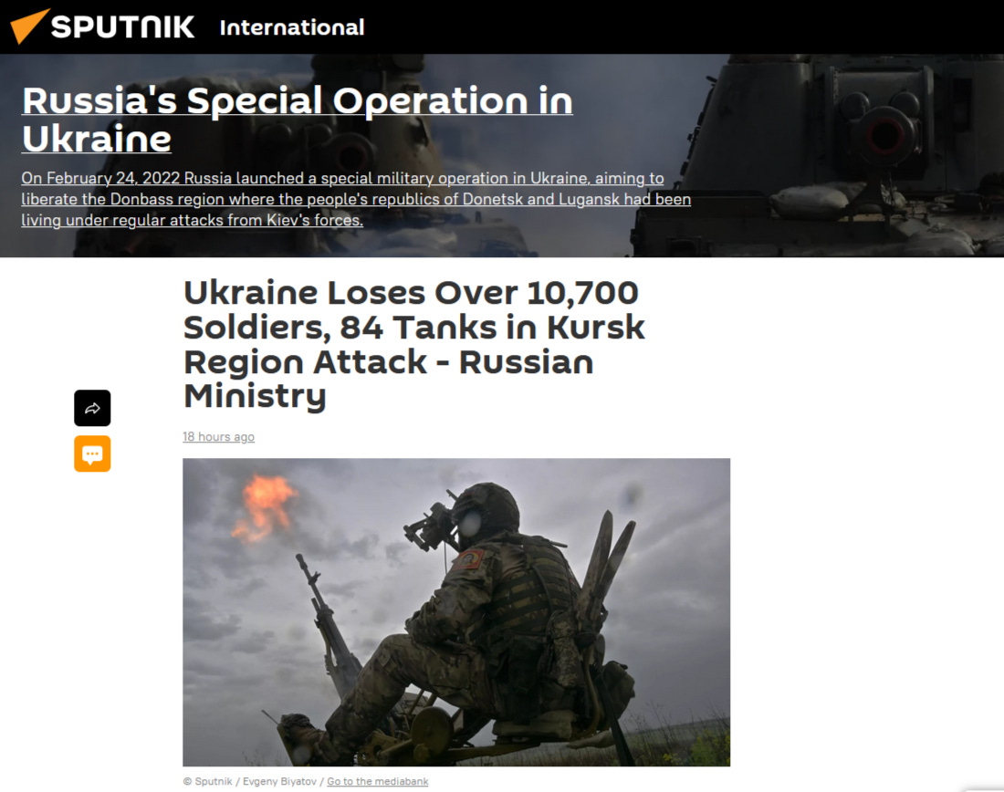 The Ukrainian armed forces have lost over 10,700 soldiers and 84 tanks in the course of the offensive in Russia’s Kursk Region, the Russian Defense Ministry said on Saturday.