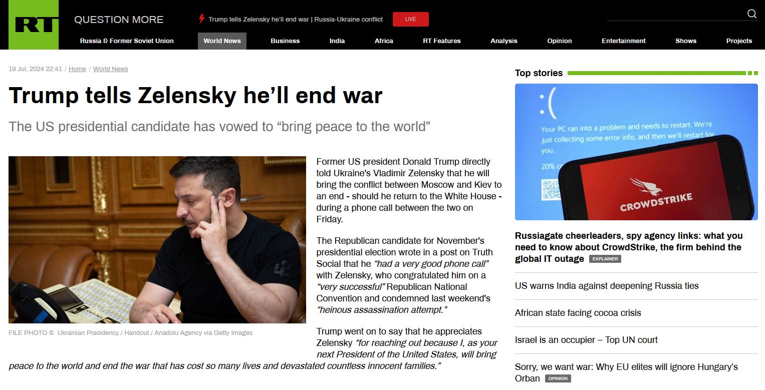 The Republican candidate for November's presidential election wrote in a post on Truth Social that he “had a very good phone call” with Zelensky, who congratulated him on a “very successful” Republican National Convention and condemned last weekend's “heinous assassination attempt.”