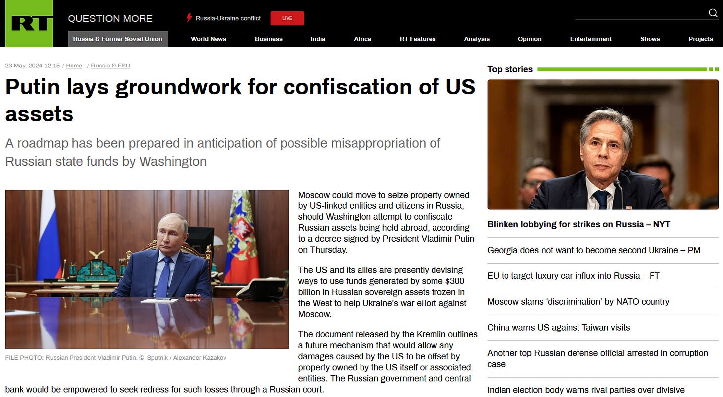 Moscow could move to seize property owned by US-linked entities and citizens in Russia, should Washington attempt to confiscate Russian assets being held abroad, according to a decree signed by President Vladimir Putin on Thursday.