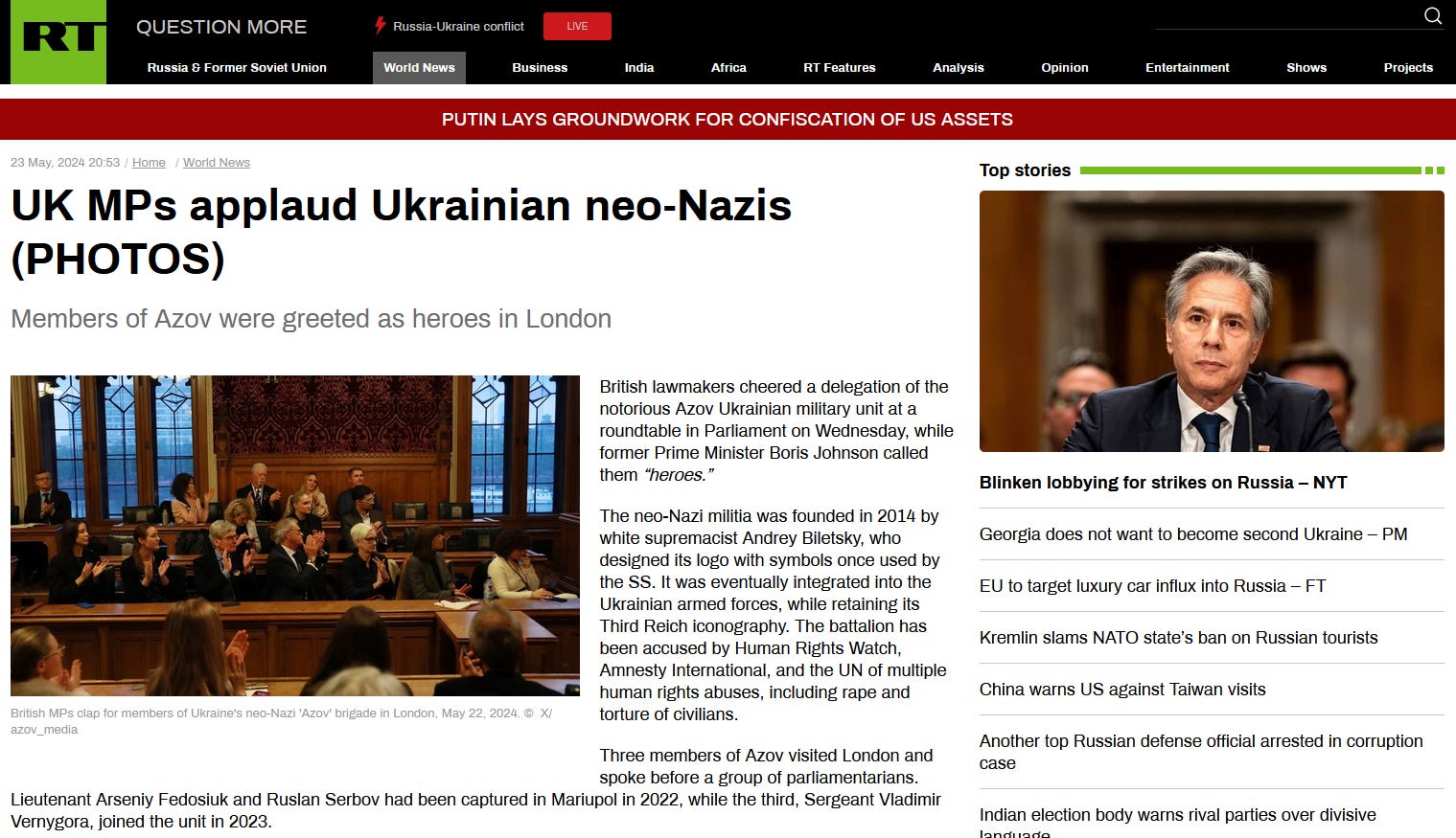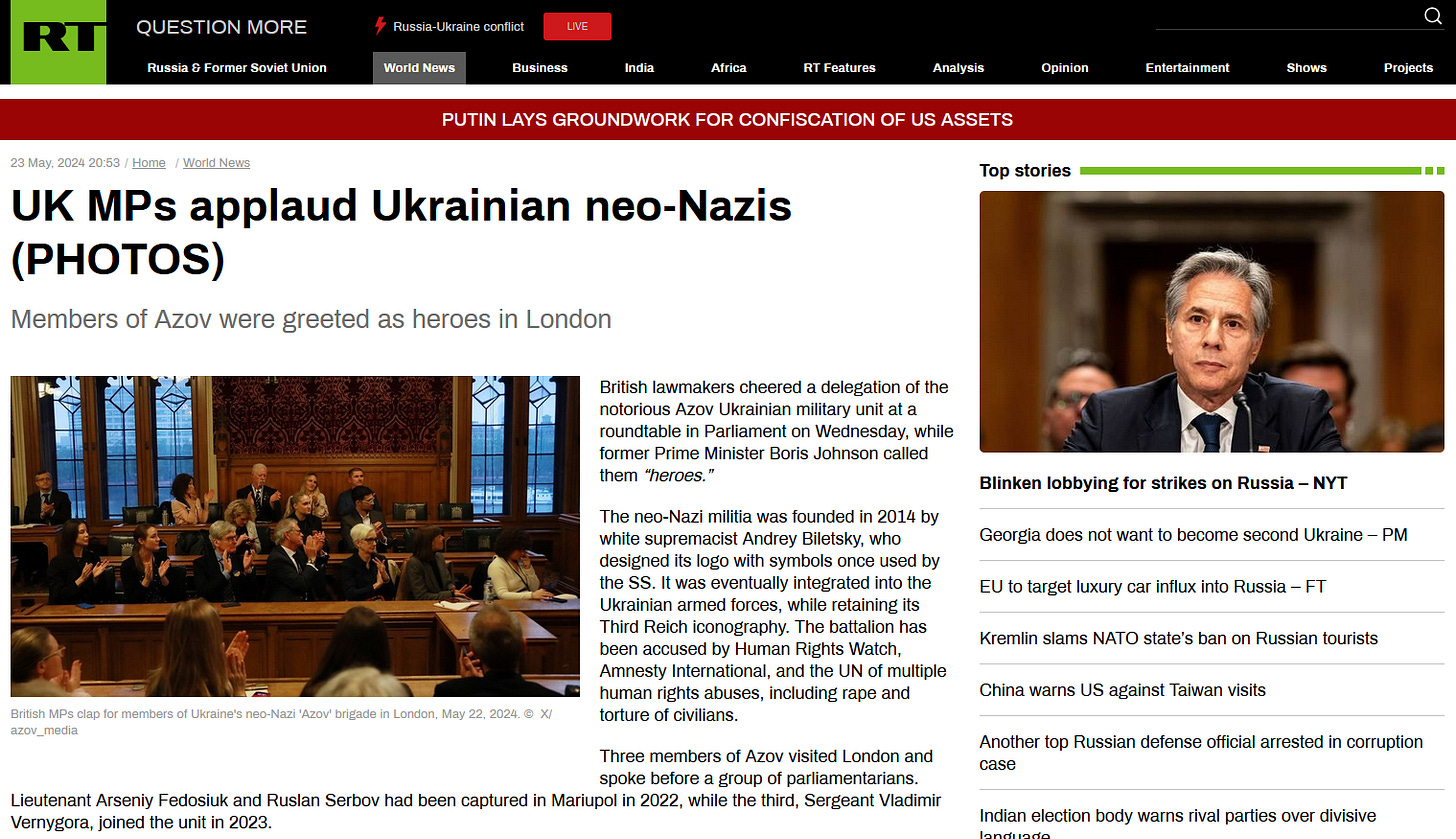 Azov, which is banned in Russia as an extremist organization, posted photos of the meeting on its X (formerly Twitter) account, thanking the sponsors of their parliamentary visit.