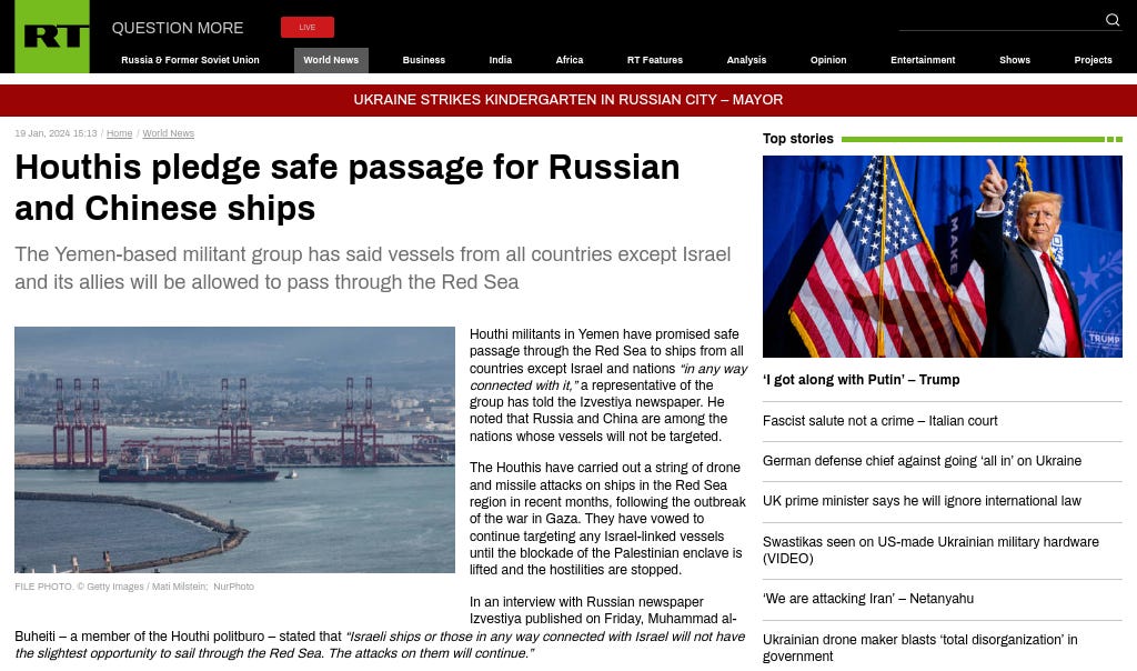 Houthi militants in Yemen have promised safe passage through the Red Sea to ships from all countries except Israel and nations “in any way connected with it,” a representative of the group has told the Izvestiya newspaper. He noted that Russia and China are among the nations whose vessels will not be targeted.