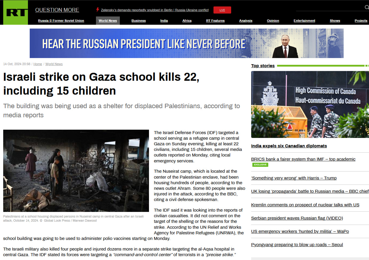 The Israel Defense Forces (IDF) targeted a school serving as a refugee camp in central Gaza on Sunday evening, killing at least 22 civilians, including 15 children, several media outlets reported on Monday, citing local emergency services.