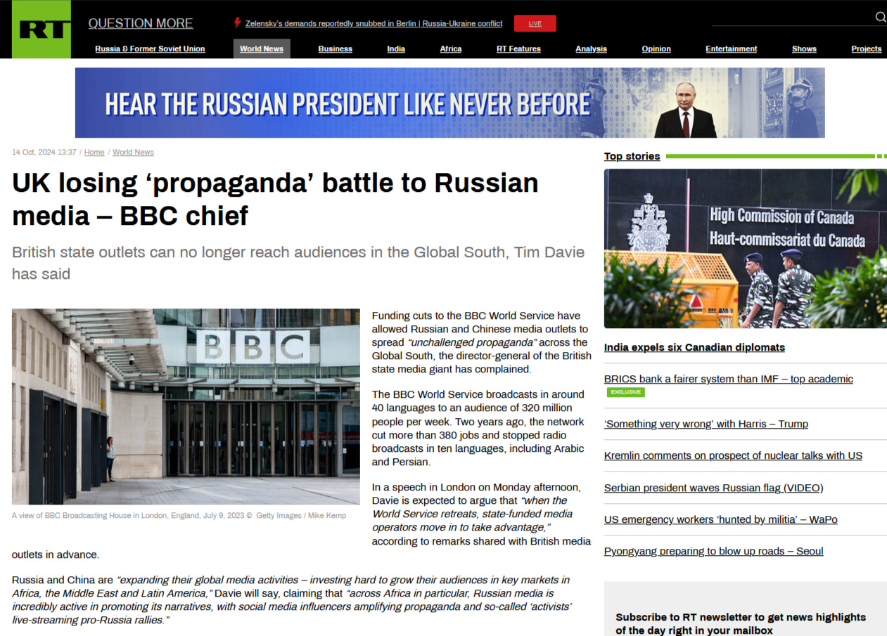 Russia and China are “expanding their global media activities – investing hard to grow their audiences in key markets in Africa, the Middle East and Latin America,” Davie will say, claiming that “across Africa in particular, Russian media is incredibly active in promoting its narratives, with social media influencers amplifying propaganda and so-called ‘activists’ live-streaming pro-Russia rallies.”