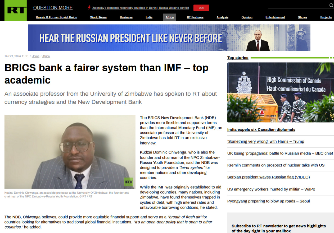 Kudzai Dominic Chiwenga, who is also the founder and chairman of the NPC Zimbabwe-Russia Youth Foundation, said the NDB was designed to provide a “fairer system” for member nations and other developing countries.