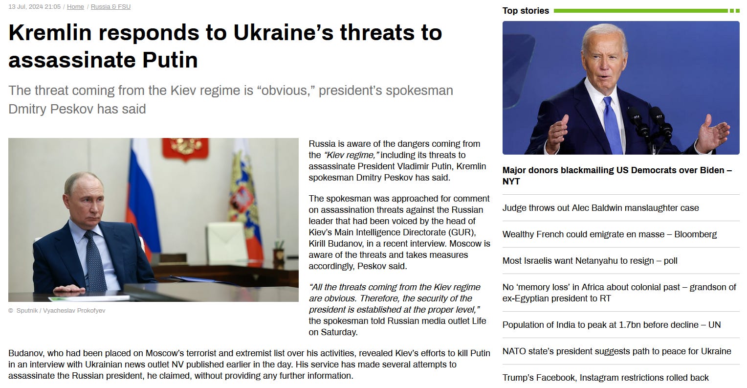 The spokesman was approached for comment on assassination threats against the Russian leader that had been voiced by the head of Kiev’s Main Intelligence Directorate (GUR), Kirill Budanov, in a recent interview. Moscow is aware of the threats and takes measures accordingly, Peskov said.