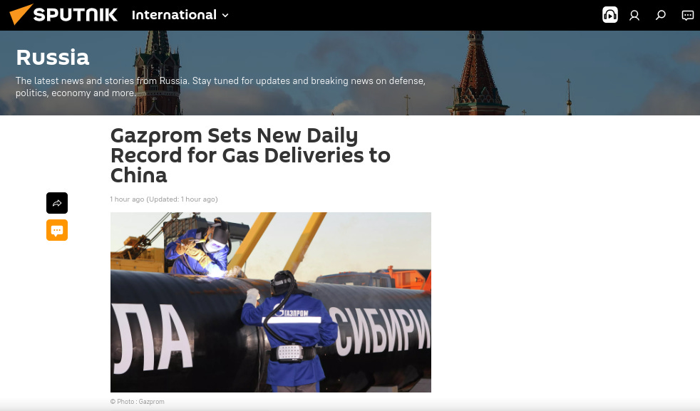 Gazprom Sets New Daily Record for Gas Deliveries to China.