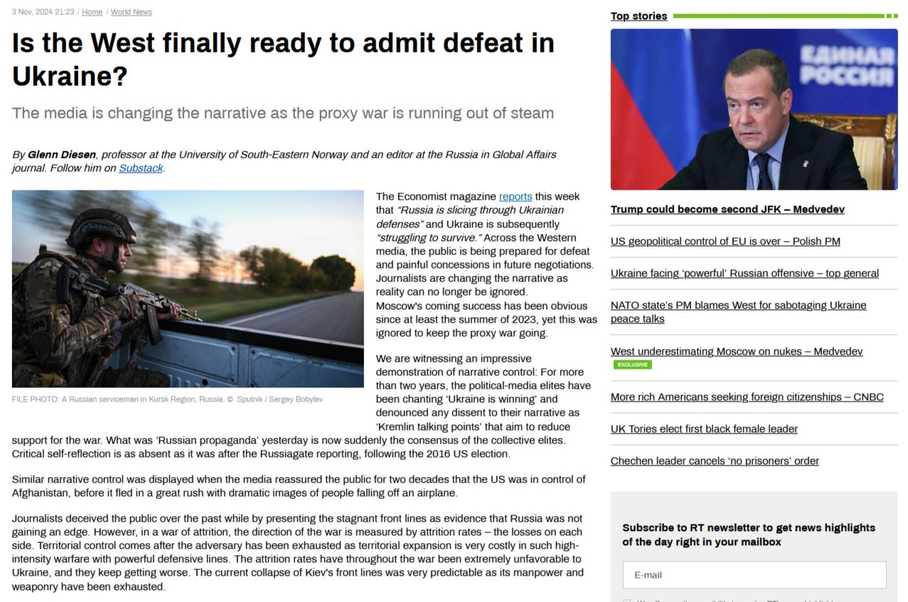 The Economist magazine reports this week that “Russia is slicing through Ukrainian defenses” and Ukraine is subsequently “struggling to survive.” Across the Western media, the public is being prepared for defeat and painful concessions in future negotiations. Journalists are changing the narrative as reality can no longer be ignored. Moscow's coming success has been obvious since at least the summer of 2023, yet this was ignored to keep the proxy war going.