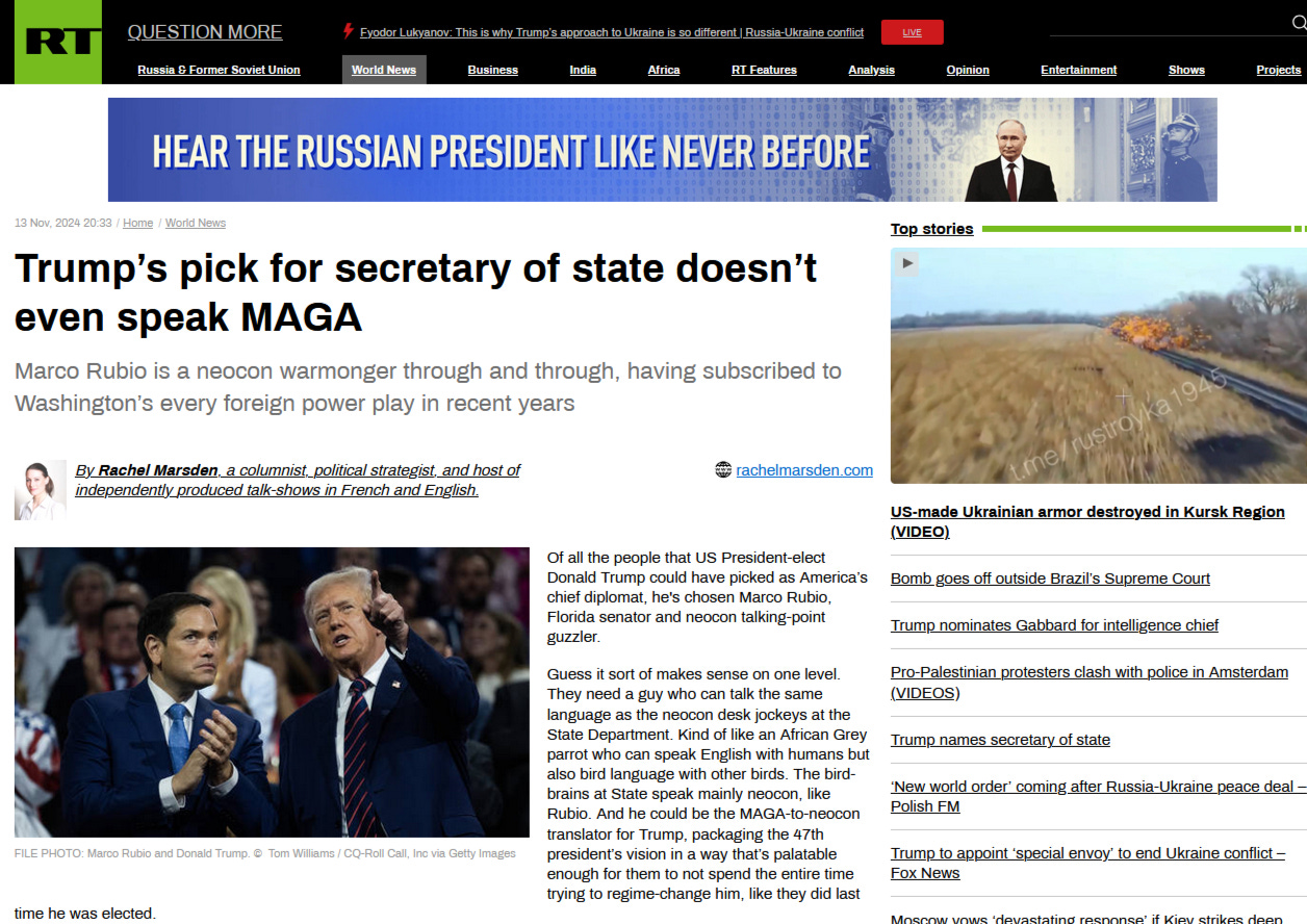 Guess it sort of makes sense on one level. They need a guy who can talk the same language as the neocon desk jockeys at the State Department. Kind of like an African Grey parrot who can speak English with humans but also bird language with other birds. The bird-brains at State speak mainly neocon, like Rubio. And he could be the MAGA-to-neocon translator for Trump, packaging the 47th president’s vision in a way that’s palatable enough for them to not spend the entire time trying to regime-change him, like they did last time he was elected.