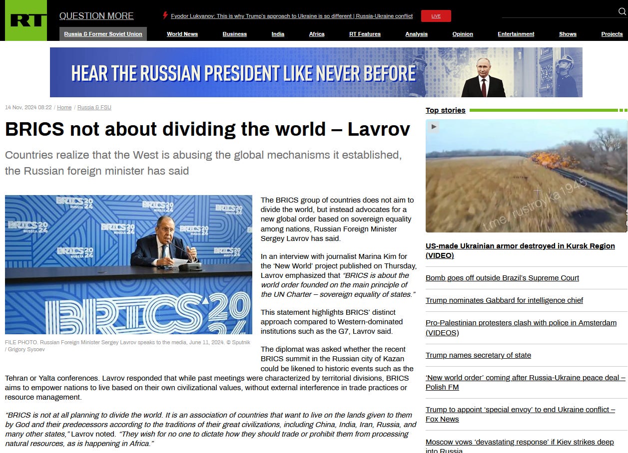 The diplomat was asked whether the recent BRICS summit in the Russian city of Kazan could be likened to historic events such as the Tehran or Yalta conferences. Lavrov responded that while past meetings were characterized by territorial divisions, BRICS aims to empower nations to live based on their own civilizational values, without external interference in trade practices or resource management.