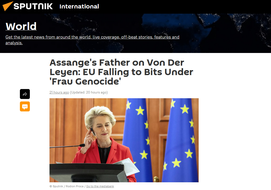Assange's Father on Von Der Leyen: EU Falling to Bits Under 'Frau Genocide'.