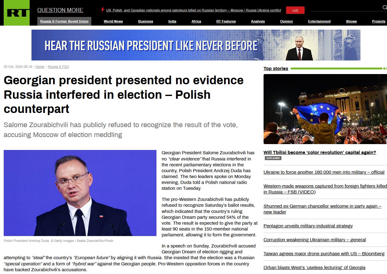 Georgian President Salome Zourabichvili has no “clear evidence” that Russia interfered in the recent parliamentary elections in the country, Polish President Andrzej Duda has claimed. The two leaders spoke on Monday evening, Duda told a Polish national radio station on Tuesday.