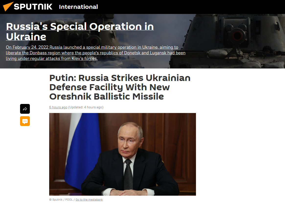"In response to the use of American and British weaponry on November 21 this year, Russian armed forces conducted a combined strike on one of Ukraine's defense-industrial complex facilities. This included testing one of Russia's latest medium-range missile systems in combat conditions. In this case, a ballistic missile equipped with non-nuclear hypersonic technology, referred to as Oreshnik by our missile forces, [was used]" Putin stated during his address.