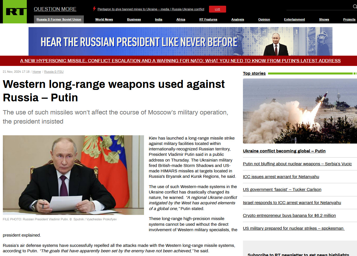 Moscow also responded to the use of the British- and American-made long-range weapons with a combined missile strike of its own, the Russian president said. According to Putin, the attack involved some of the most advanced Russian weapons, including a new ballistic missile. The strike targeted a military industrial facility in the Ukrainian city of Dnepropetrovsk (also known as Dnipro in Ukraine).