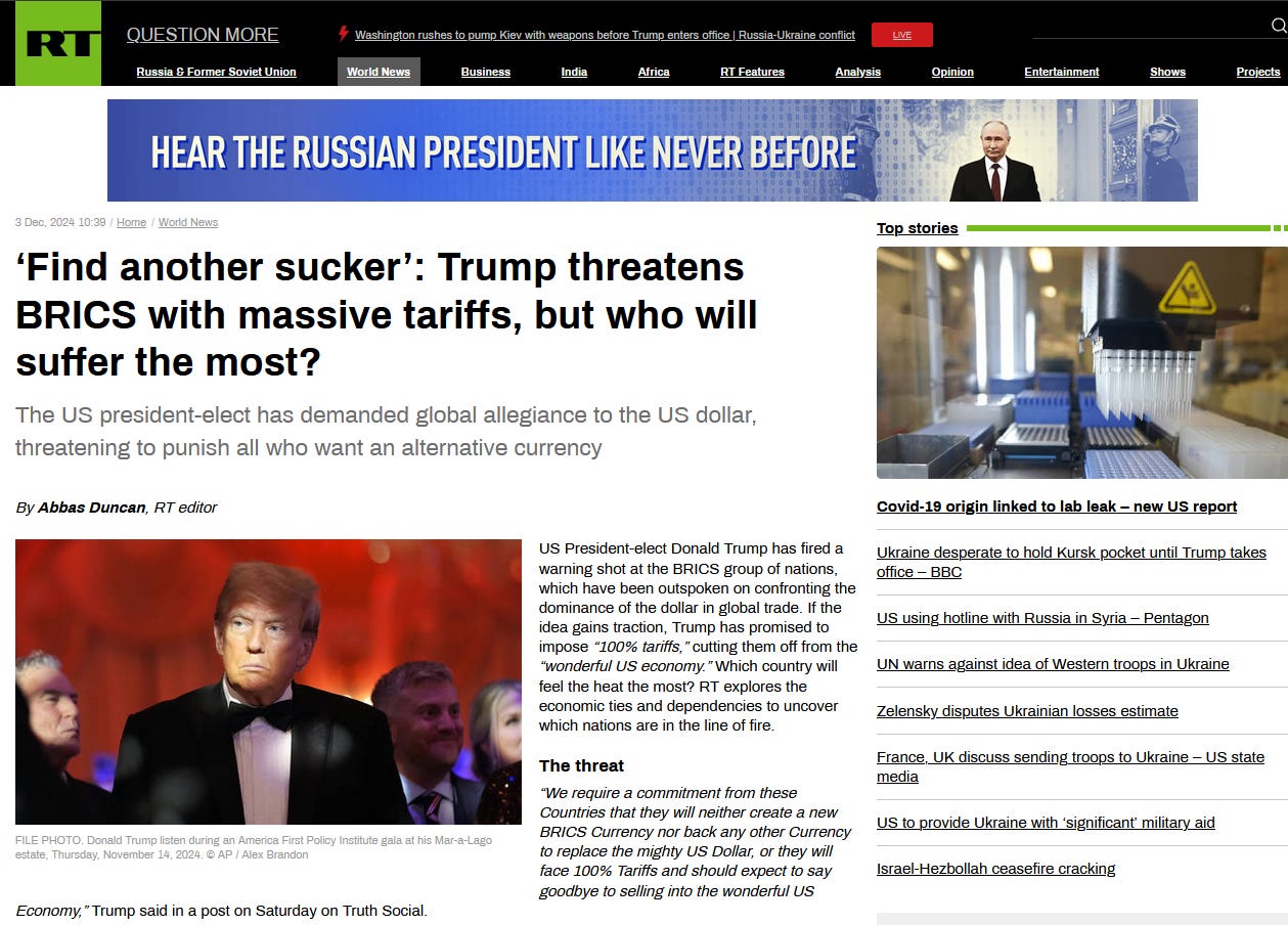 US President-elect Donald Trump has fired a warning shot at the BRICS group of nations, which have been outspoken on confronting the dominance of the dollar in global trade. If the idea gains traction, Trump has promised to impose “100% tariffs,” cutting them off from the “wonderful US economy.” Which country will feel the heat the most? RT explores the economic ties and dependencies to uncover which nations are in the line of fire.