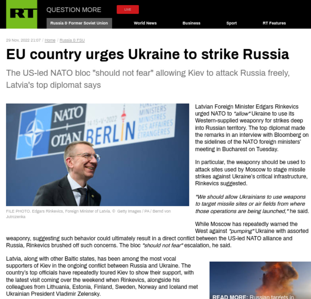 Article from Russia Today (RT) - 30th November 2022 : EU country urges Ukraine to strike Russia
