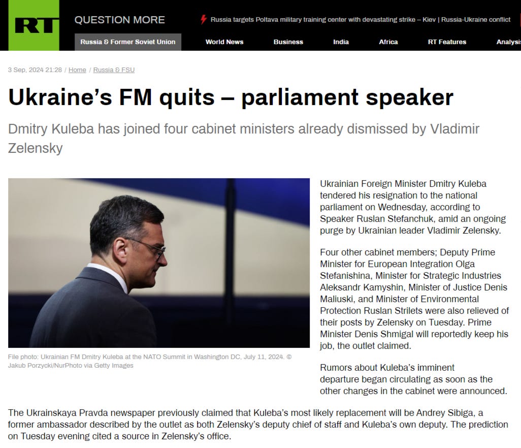 The Ukrainskaya Pravda newspaper previously claimed that Kuleba’s most likely replacement will be Andrey Sibiga, a former ambassador described by the outlet as both Zelensky’s deputy chief of staff and Kuleba’s own deputy. The prediction on Tuesday evening cited a source in Zelensky’s office.