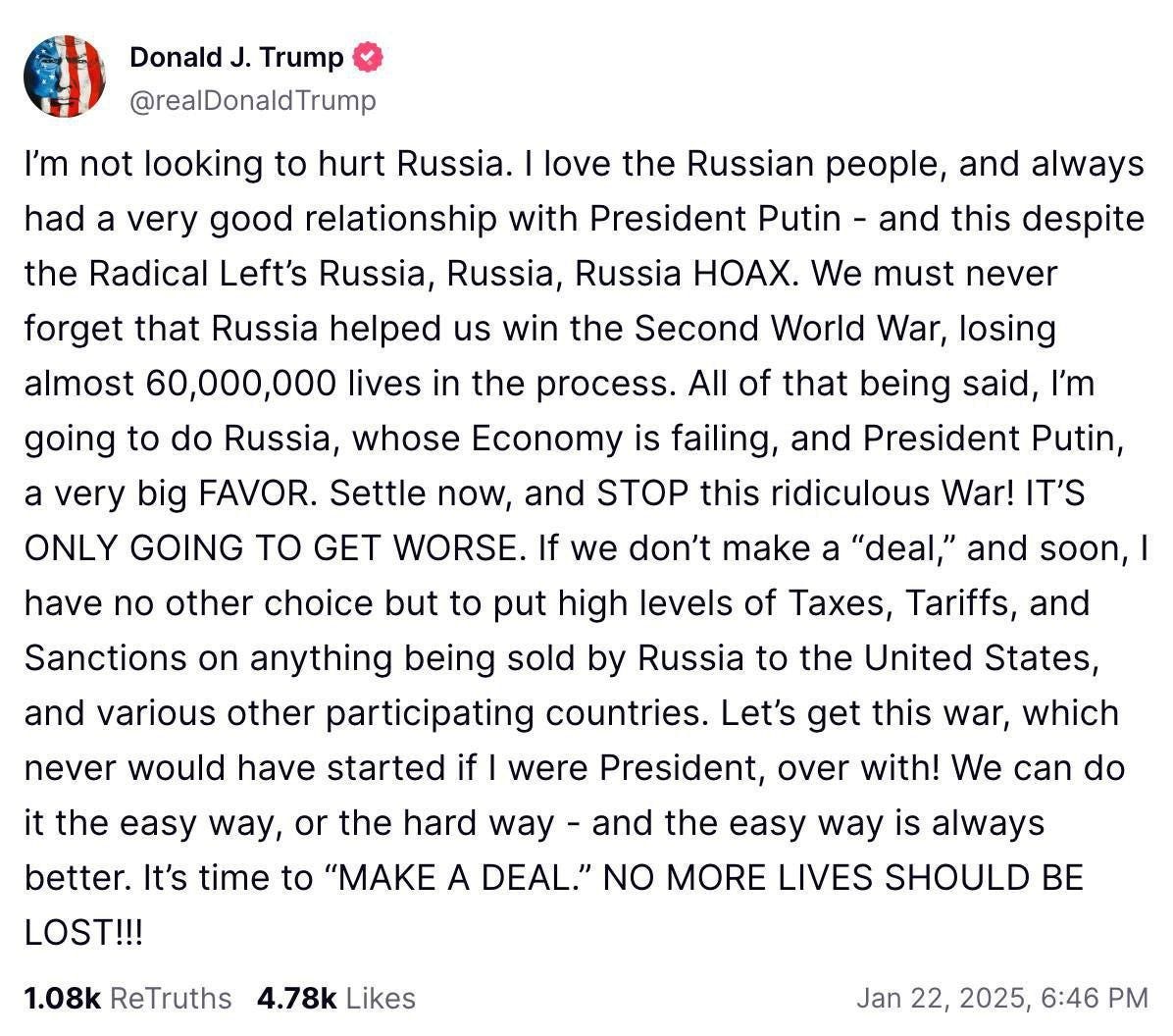 “Calm down now and STOP this ridiculous war! IT WILL ONLY GET WORSE. If we don’t make a ‘deal’, I will have no choice but to impose high taxes, tariffs, and sanctions on everything Russia sells to the United States.”