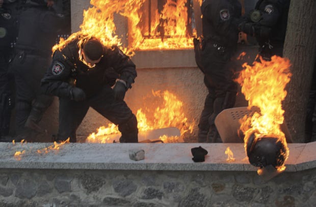 At any rate the event above proved the crucial break point in the entire catalog of chaotic events that had stretched over many months. The militarisation of those protesting/demonstrating/rioting had been clear for some times. I recall images of those wearing symbols reminiscent of the Nazi Wolfsangel posing with weapons in some forces (quite likely in Poland) where they appeared to have been training in army fatigues and various military accessories. A squad of men claimed to have been ex-IDF troops who had come all the way from Israel to fight on the square. The atmosphere had reached fever pitch where there was no longer simply a protest going on but an all out constant riot and violent insurrection. Government buildings had been set on fire and every possible attempt had been made to kill as many of the young police forces as possible.