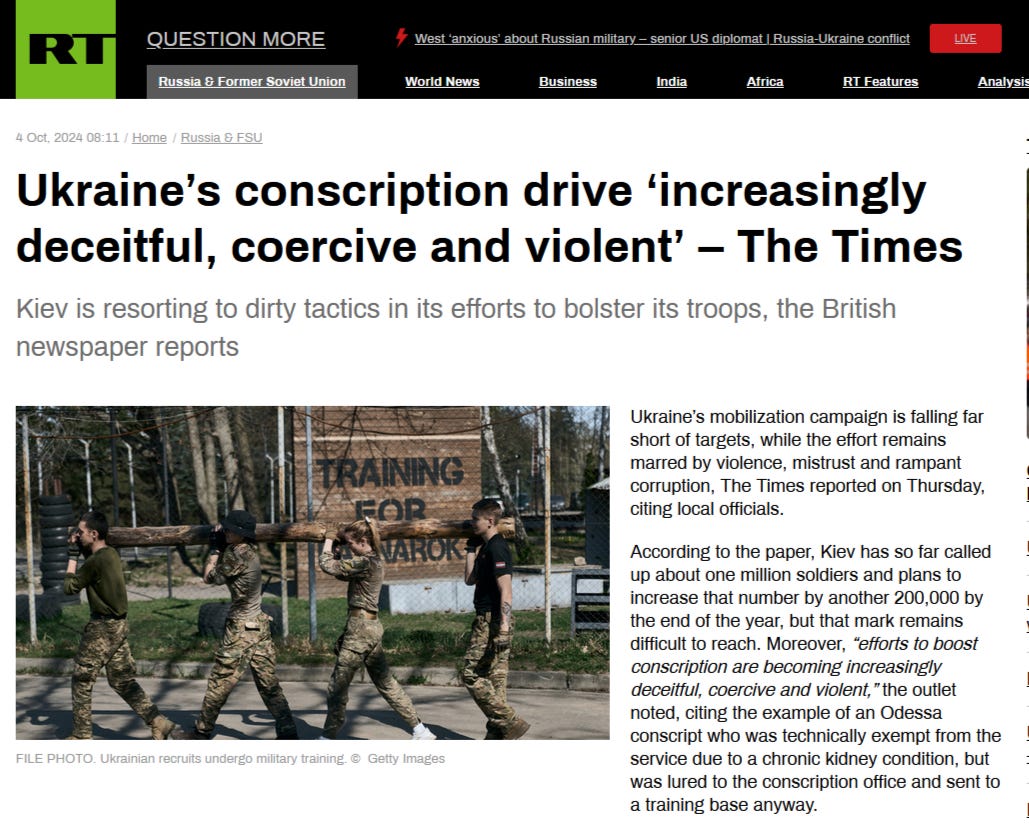 Ukraine’s conscription drive ‘increasingly deceitful, coercive and violent’ – The Times.