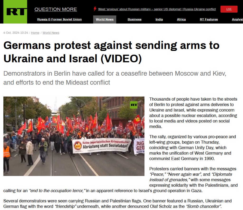 Thousands of people have taken to the streets of Berlin to protest against arms deliveries to Ukraine and Israel, while expressing concern about a possible nuclear escalation, according to local media and videos posted on social media.
