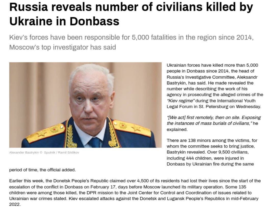 Ukrainian forces have killed more than 5,000 people in Donbass since 2014, the head of Russia’s Investigative Committee, Aleksandr Bastrykin, has said. He made revealed the number while describing the work of his agency in prosecuting the alleged crimes of the “Kiev regime” during the International Youth Legal Forum in St. Petersburg on Wednesday.