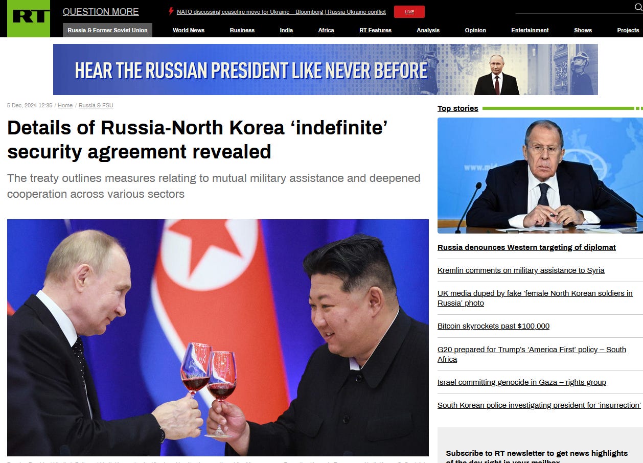 During the visit of Russian President Vladimir Putin to Pyongyang on June 18-19, Russia and the DPRK signed the Comprehensive Strategic Partnership Treaty, the fourth article of which states: "If one of the Parties is subjected to an armed attack by any state or several states and thus finds itself in a state of war, the other Party will immediately provide military and other assistance by all means at its disposal."