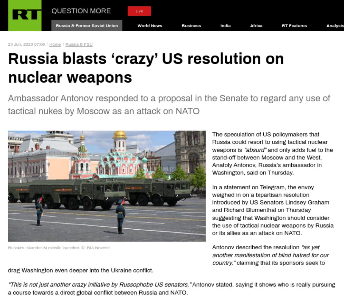 In a statement on Telegram, the envoy weighed in on a bipartisan resolution introduced by US Senators Lindsey Graham and Richard Blumenthal on Thursday suggesting that Washington should consider the use of tactical nuclear weapons by Russia or its allies as an attack on NATO.