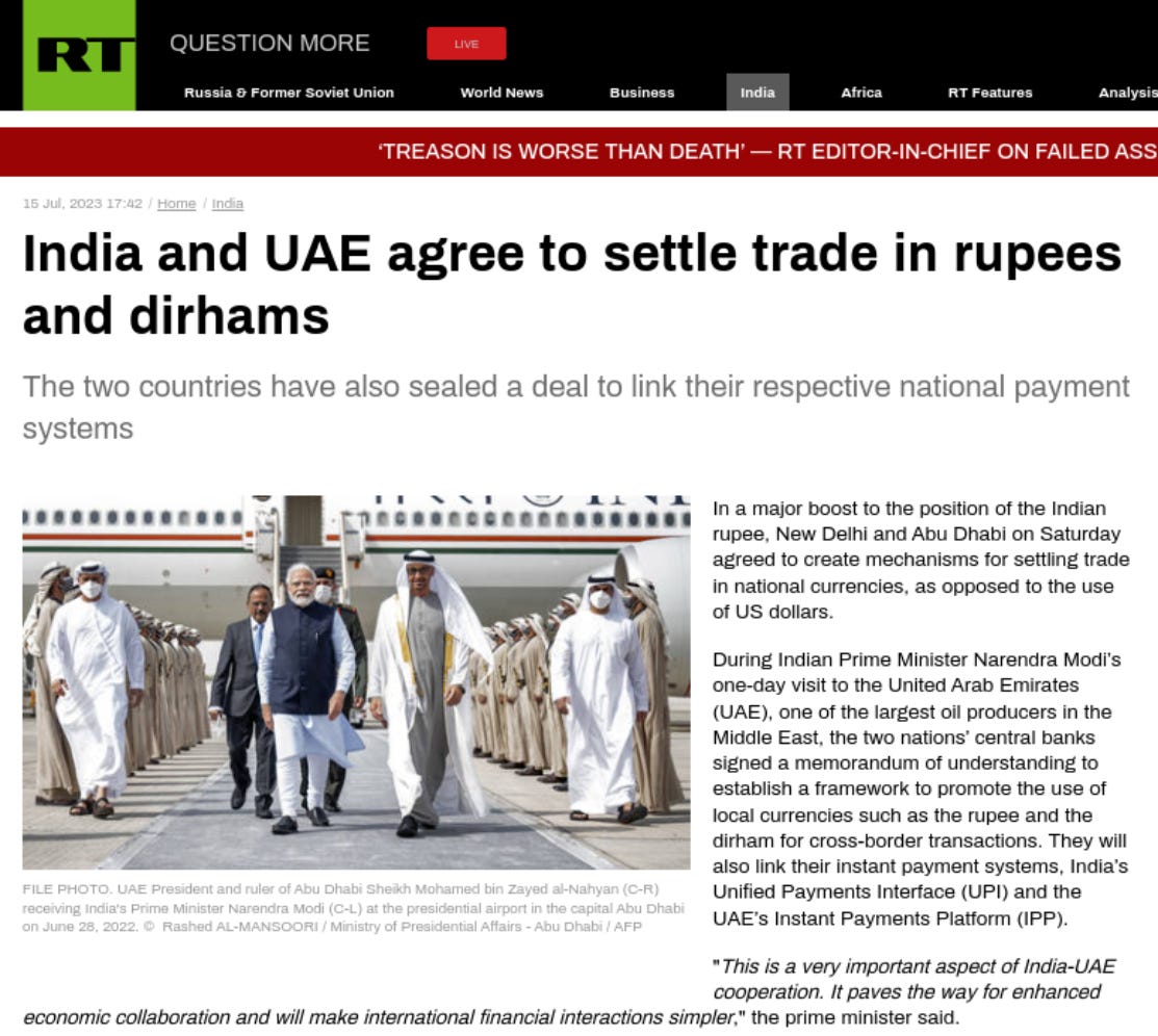 During Indian Prime Minister Narendra Modi’s one-day visit to the United Arab Emirates (UAE), one of the largest oil producers in the Middle East, the two nations’ central banks signed a memorandum of understanding to establish a framework to promote the use of local currencies such as the rupee and the dirham for cross-border transactions. They will also link their instant payment systems, India’s Unified Payments Interface (UPI) and the UAE’s Instant Payments Platform (IPP).