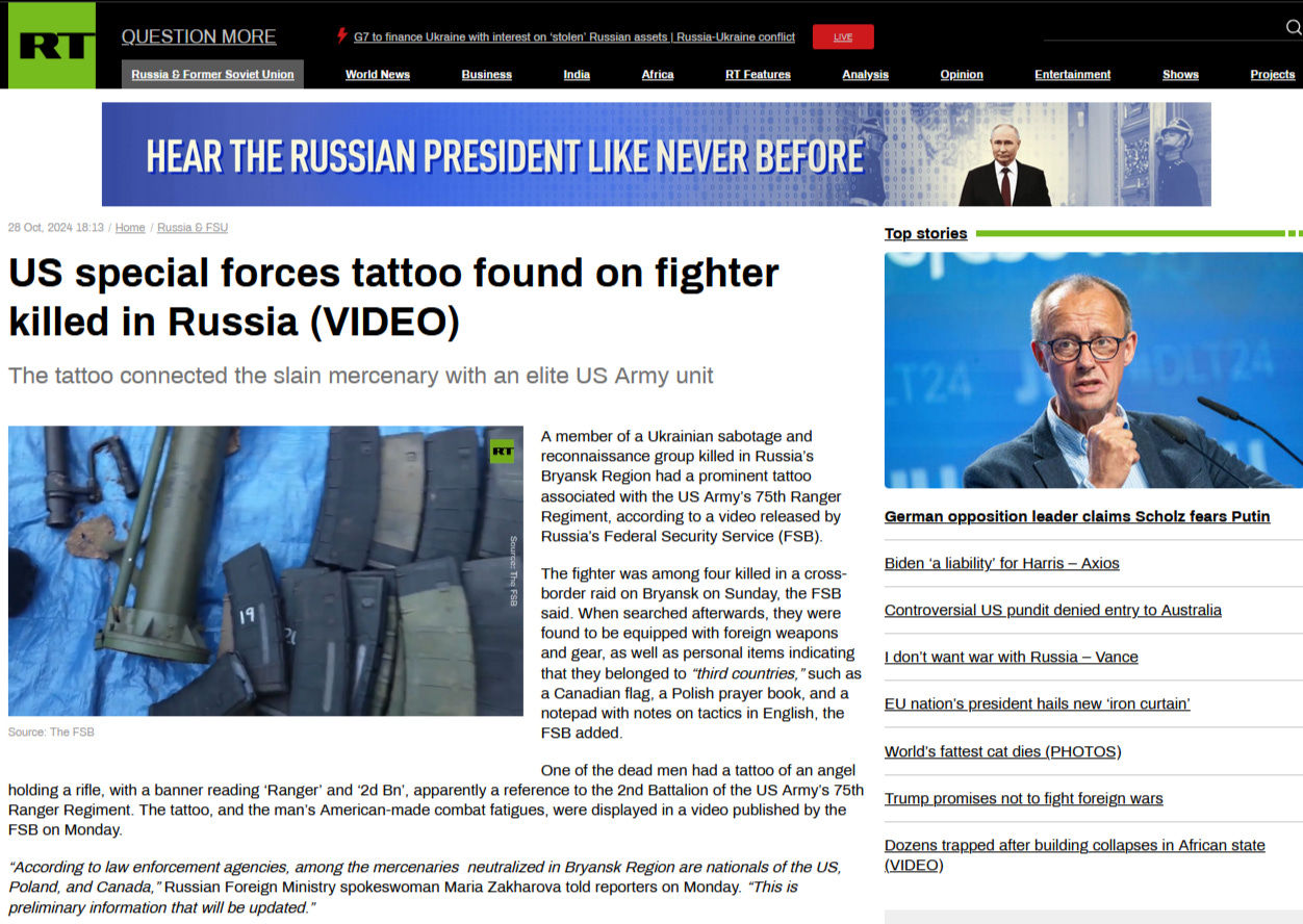 One of the dead men had a tattoo of an angel holding a rifle, with a banner reading ‘Ranger’ and ‘2d Bn’, apparently a reference to the 2nd Battalion of the US Army’s 75th Ranger Regiment. The tattoo, and the man’s American-made combat fatigues, were displayed in a video published by the FSB on Monday.