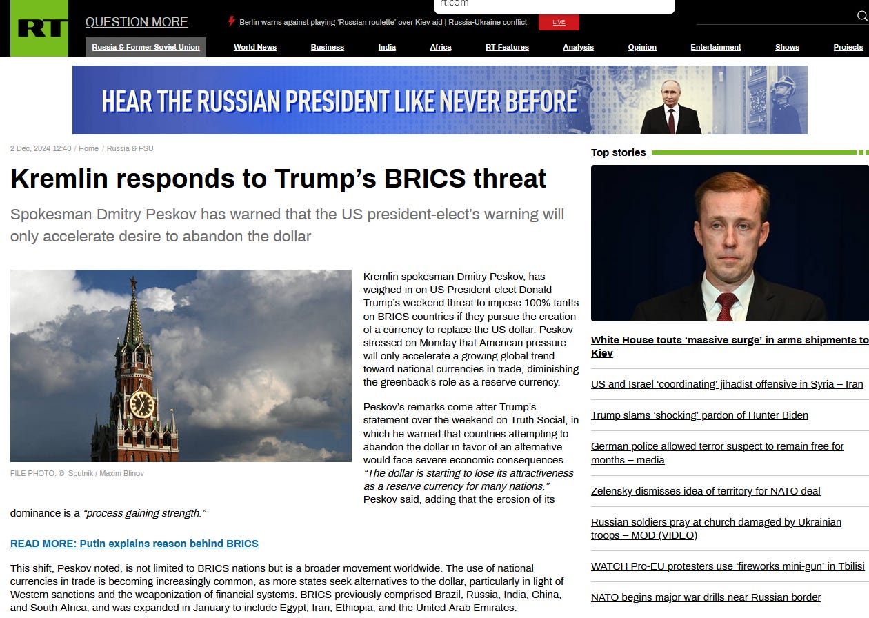 Kremlin spokesman Dmitry Peskov, has weighed in on US President-elect Donald Trump’s weekend threat to impose 100% tariffs on BRICS countries if they pursue the creation of a currency to replace the US dollar. Peskov stressed on Monday that American pressure will only accelerate a growing global trend toward national currencies in trade, diminishing the greenback’s role as a reserve currency.