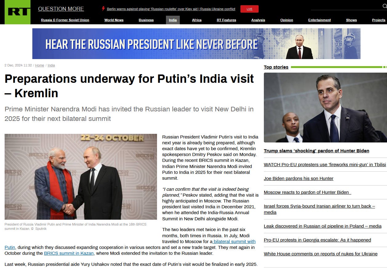 Russian President Vladimir Putin’s visit to India next year is already being prepared, although exact dates have yet to be confirmed, Kremlin spokesperson Dmitry Peskov said on Monday. During the recent BRICS summit in Kazan, Indian Prime Minister Narendra Modi invited Putin to India in 2025 for their next bilateral summit.