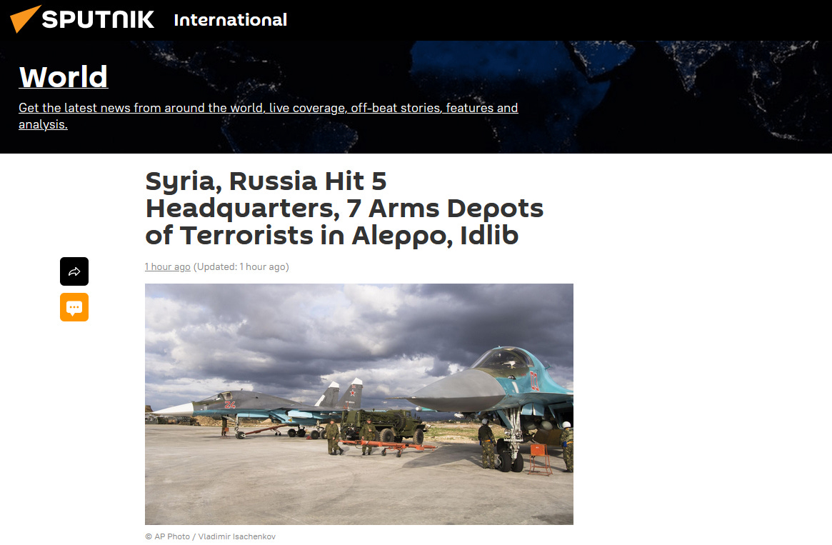 Syria, Russia Hit 5 Headquarters, 7 Arms Depots of Terrorists in Aleppo, Idlib.