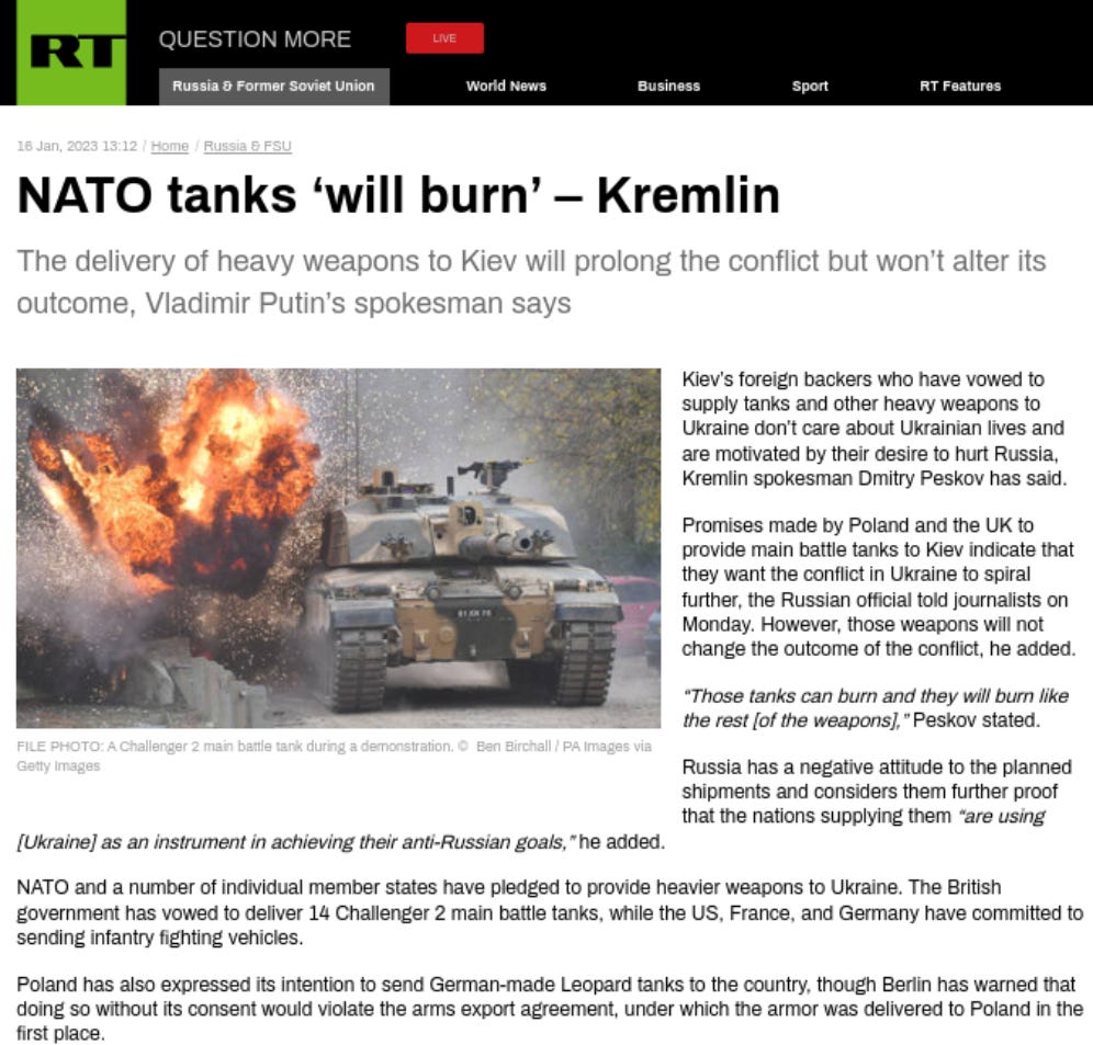 Article from Russia Today (RT) - 17th January 2023 : NATO tanks ‘will burn’ – Kremli