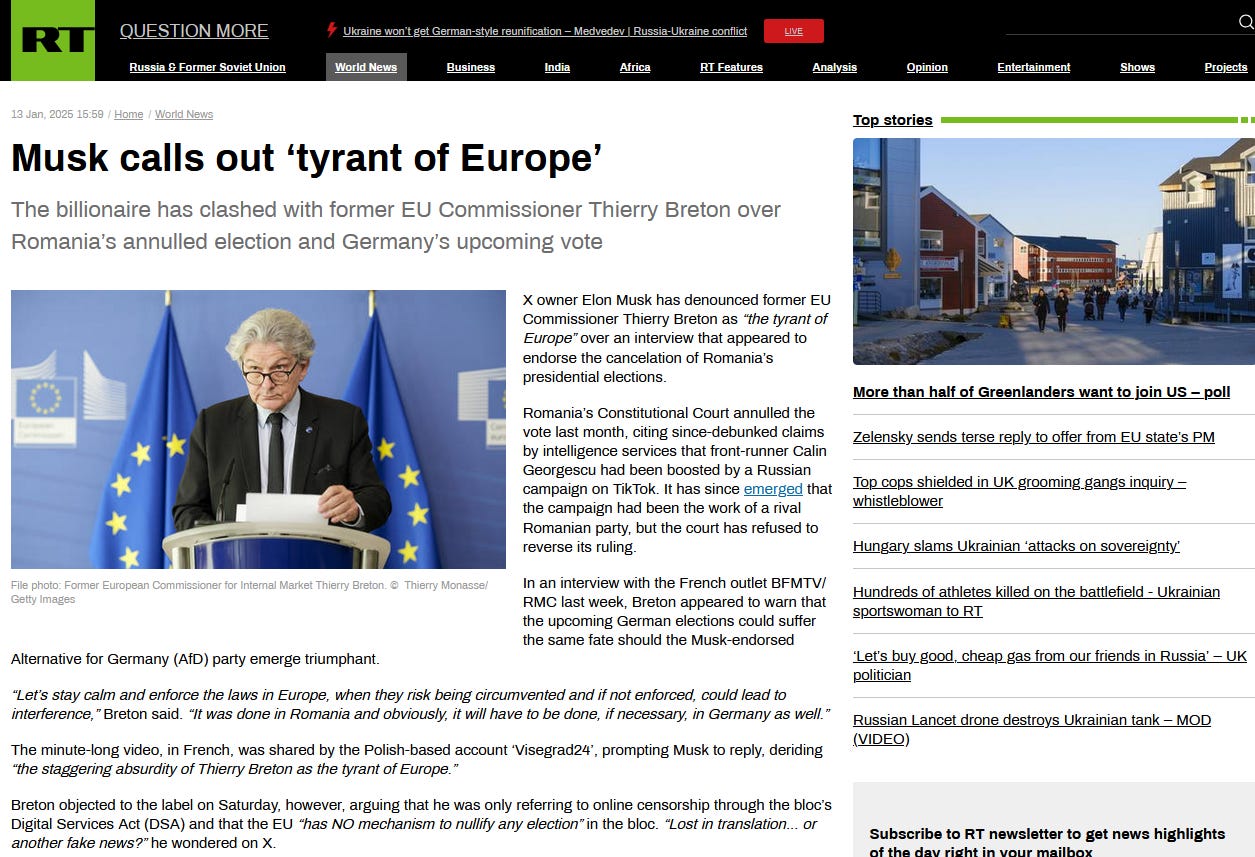In an interview with the French outlet BFMTV/RMC last week, Breton appeared to warn that the upcoming German elections could suffer the same fate should the Musk-endorsed Alternative for Germany (AfD) party emerge triumphant.