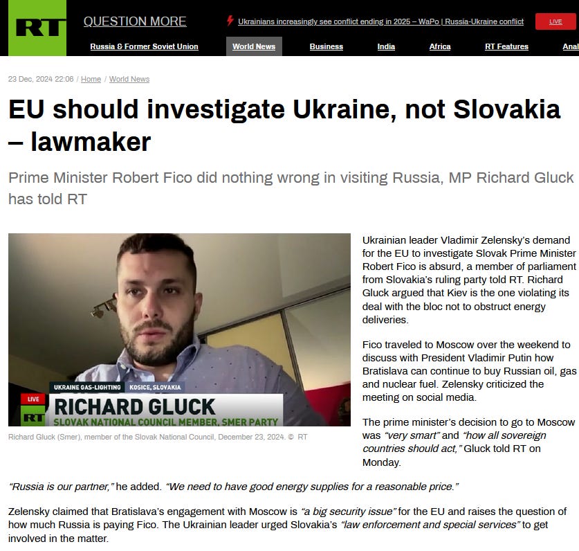 Ukrainian leader Vladimir Zelensky’s demand for the EU to investigate Slovak Prime Minister Robert Fico is absurd, a member of parliament from Slovakia’s ruling party told RT. Richard Gluck argued that Kiev is the one violating its deal with the bloc not to obstruct energy deliveries.