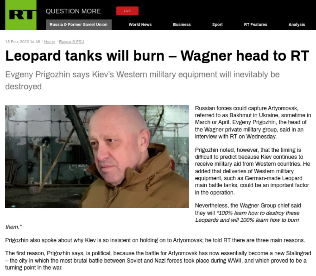 Article from Russia Today (RT) - 16th February 2023 : Leopard tanks will burn – Wagner head to RT