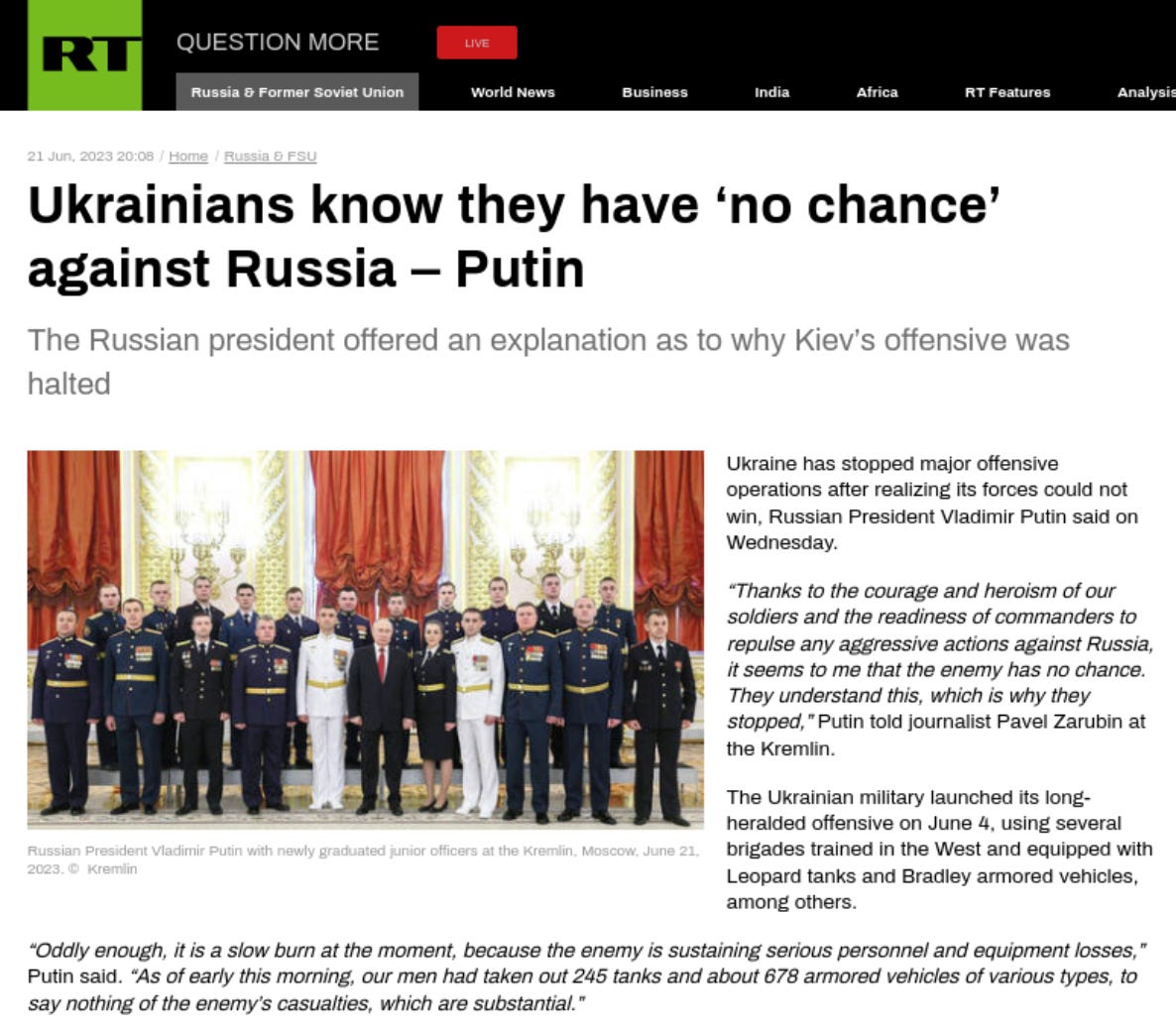 “Thanks to the courage and heroism of our soldiers and the readiness of commanders to repulse any aggressive actions against Russia, it seems to me that the enemy has no chance. They understand this, which is why they stopped,” Putin told journalist Pavel Zarubin at the Kremlin.
