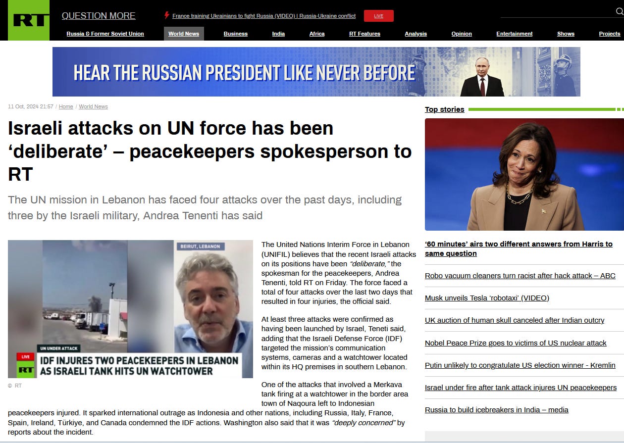 The United Nations Interim Force in Lebanon (UNIFIL) believes that the recent Israeli attacks on its positions have been “deliberate,” the spokesman for the peacekeepers, Andrea Tenenti, told RT on Friday. The force faced a total of four attacks over the last two days that resulted in four injuries, the official said.