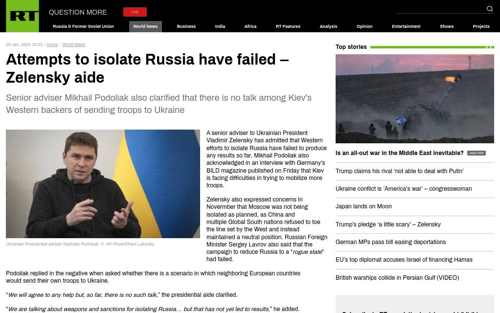 A senior adviser to Ukrainian President Vladimir Zelensky has admitted that Western efforts to isolate Russia have failed to produce any results so far. Mikhail Podoliak also acknowledged in an interview with Germany’s BILD magazine published on Friday that Kiev is facing difficulties in trying to mobilize more troops.