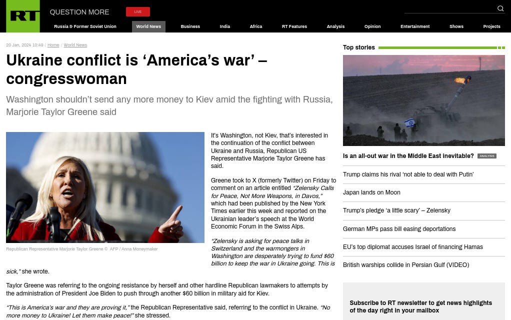 “This is America’s war and they are proving it,” the Republican Representative said, referring to the conflict in Ukraine. “No more money to Ukraine! Let them make peace!” she stressed.
