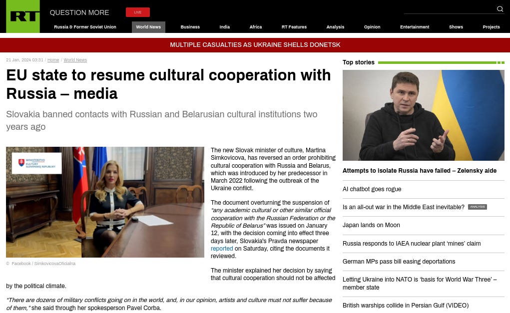 The document overturning the suspension of “any academic cultural or other similar official cooperation with the Russian Federation or the Republic of Belarus” was issued on January 12, with the decision coming into effect three days later, Slovakia's Pravda newspaper reported on Saturday, citing the documents it reviewed.