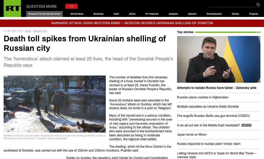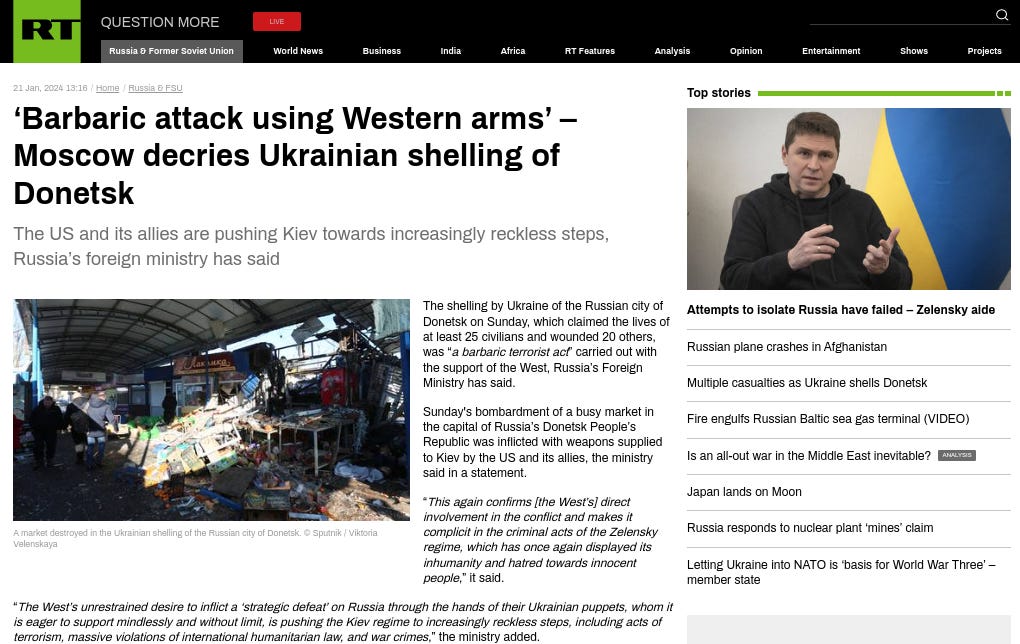 ‘Barbaric attack using Western arms’ – Moscow decries Ukrainian shelling of Donetsk.
