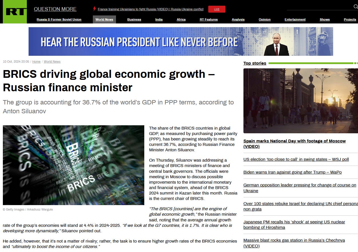 On Thursday, Siluanov was addressing a meeting of BRICS ministers of finance and central bank governors. The officials were meeting in Moscow to discuss possible improvements to the international monetary and financial system, ahead of the BRICS 2024 summit in Kazan later this month. Russia is the current chair of BRICS.
